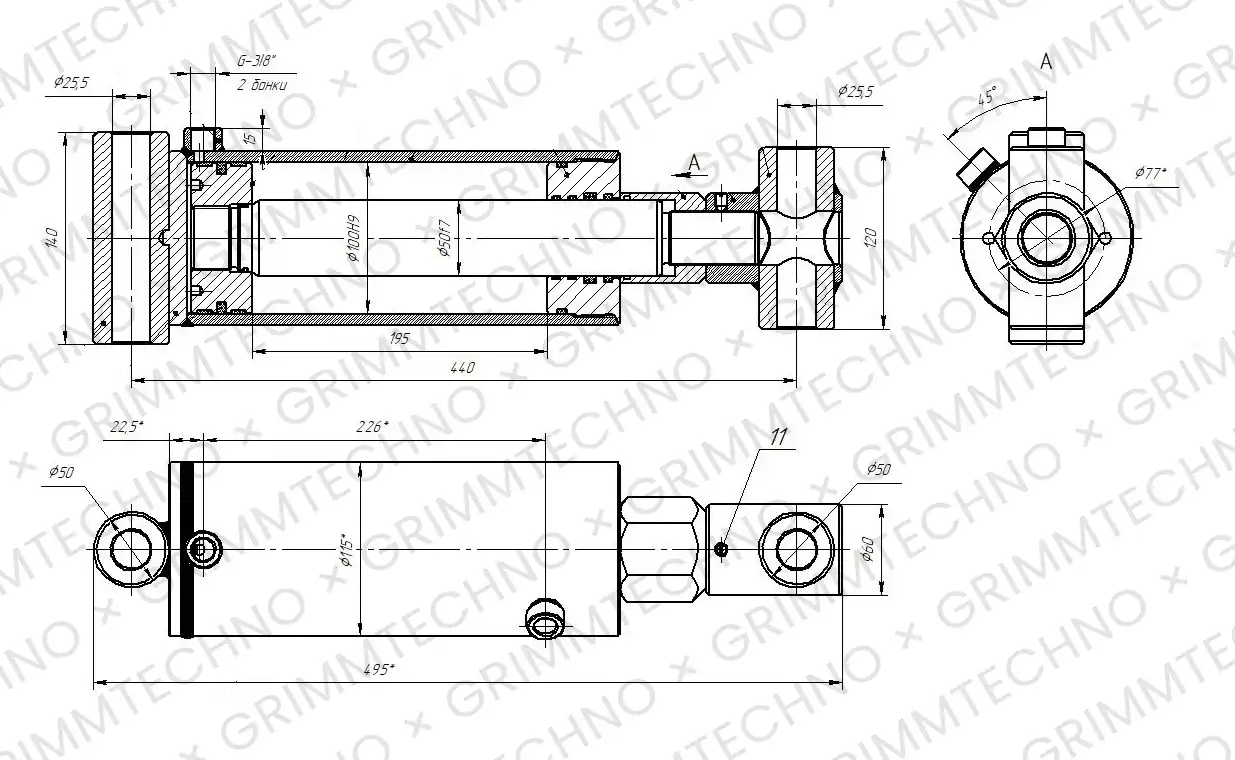 Максимальная нагрузка: толкающая 16 тонн, тянущая 12 тонн. Диаметр гильзы: 100 мм Диаметр штока: 50 мм Ход гидроцилиндра: 195 мм Установочный размер: 440 мм Максимальное рабочее давление: 200 бар Вес: 19.9 кг