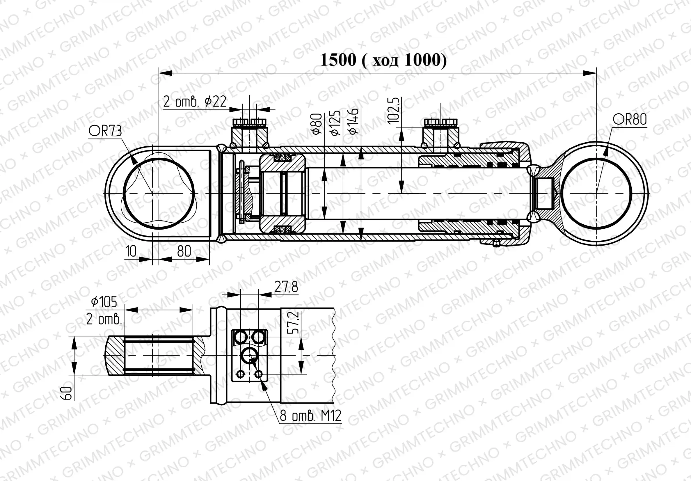 Максимальная нагрузка: толкающая 23,8 тонн, тянущая 14 тонн. Диаметр гильзы: 125 мм Диаметр штока: 80 мм Ход гидроцилиндра: 1000 мм Установочный размер: 1500 мм Максимальное рабочее давление: 240 бар Вес: 125,7 кг