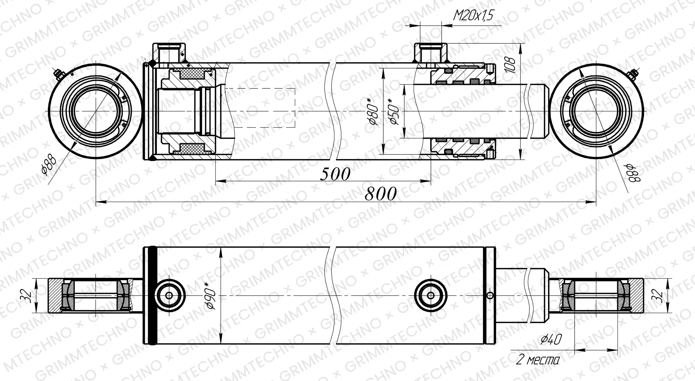 Максимальная нагрузка: толкающая 10,2 тонны, тянущая 6,2 тонны. Диаметр гильзы: 80 мм Диаметр штока: 50 мм Ход гидроцилиндра: 500 мм Установочный размер: 800 мм Максимальное рабочее давление: 200 бар Вес: 27,7 кг
