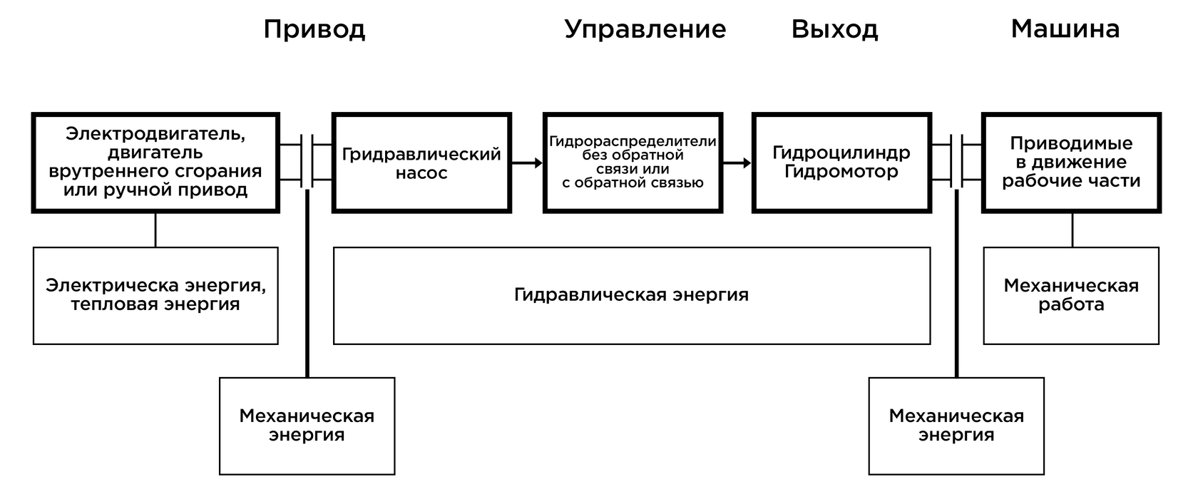 В гидроприводах механическую энергию преобразуют в гидравлическую, в этой форме осуществляется передача энергии управление и регулировка, и затем снова преобразует в механическую. В первую очередь для преобразования энергии служат гидронасосы, а во вторую – гидроцилиндры и гидромоторы. Управление/распределение рабочей жидкости осуществляется при помощи гидрораспределителей.